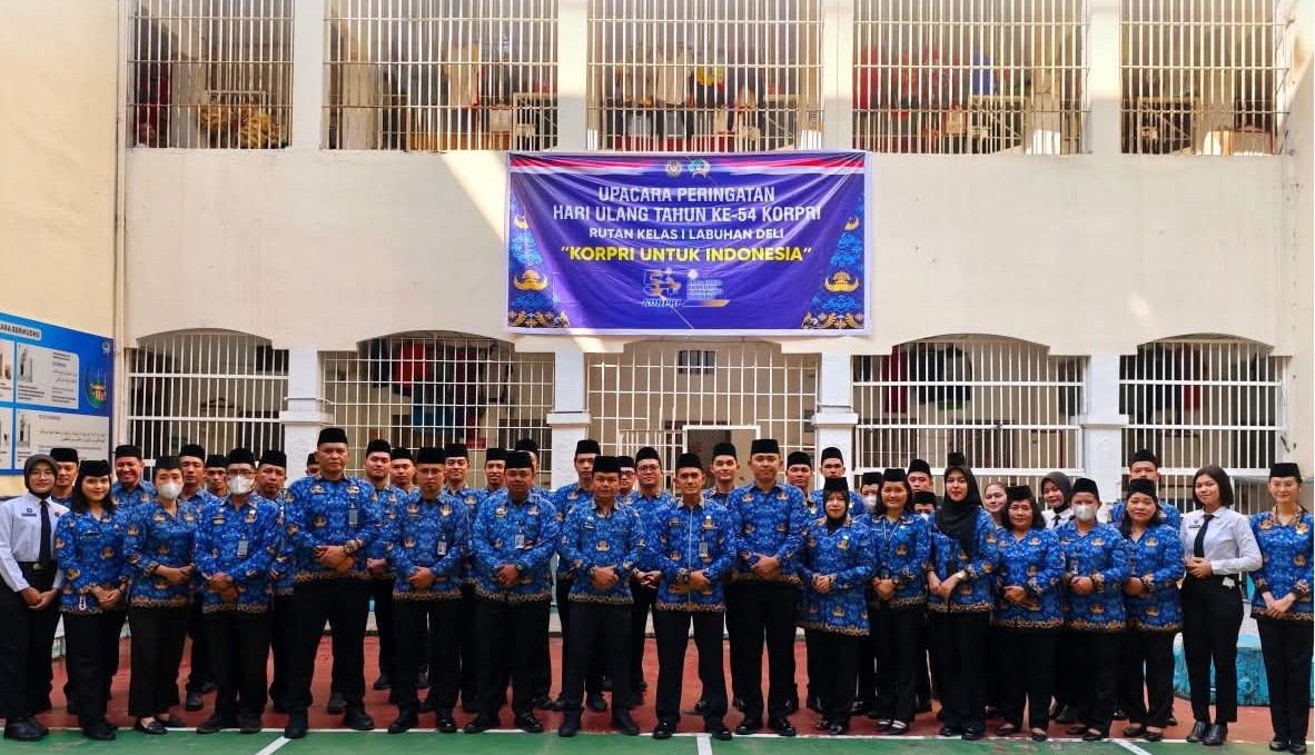 Medan – Rumah Tahanan Negara (Rutan) Kelas I Labuhan Deli menyelenggarakan Upacara Peringatan Hari Korps Pegawai Republik Indonesia (Korpri) ke-54 pada Senin (1/12/2025). Upacara berlangsung khidmat di lapangan blok hunian Rutan, dengan diikuti oleh seluruh pejabat struktural, staf, regu pengamanan, serta pegawai magang yang turut hadir sebagai bentuk penghormatan terhadap peran dan kiprah Korpri dalam mendukung tugas pemerintahan dan pelayanan publik.