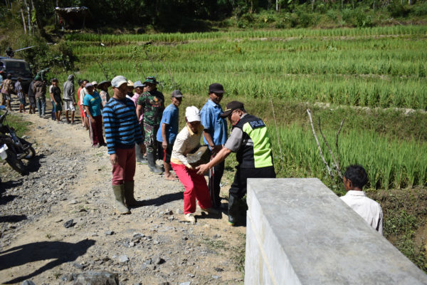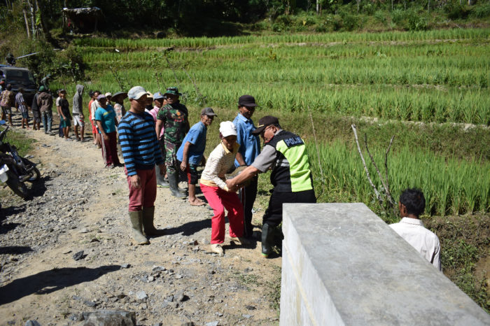Anggota Satgas TMMD yang didalamnya juga terkandung personel Polri dan pegawai Pemda, terus bahu membahu mengerjakan rabat beton, juga dalam memastikan ketersediaan material batu kali walaupun akhir-akhir ini cuaca kurang mendukung, suhu dingin di pagi hari dan terik di siang harinya.