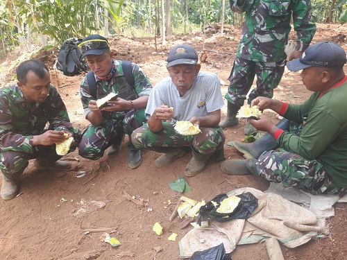 Agus yang siang itu ditemani sejumlah rekan dan warga sedang istirahat dengan berteduh di bawah pohon pinggir jalan dihampiri seorang warga yang menyodorkan buah nangka untuk di makan bersama. Buah nangka sengaja dipetik oleh Parmi, dari pohon miliknya yang tumbuh subur dan berbuah lebat. Sudah beberapa kali ini Parmi menghantarkan penganan walaupun hanya sekedar buah dari hasil kebun untuk teman istirahat siang para pekerja di lokasi TMMD. “Di desa sudah biasa kalau punya hasil kebun yang lebih ya dibagi. Apalagi ini ada bapak-bapak dari TNI yang sedang bekerja keras membantu warga,” ujarnya polos.