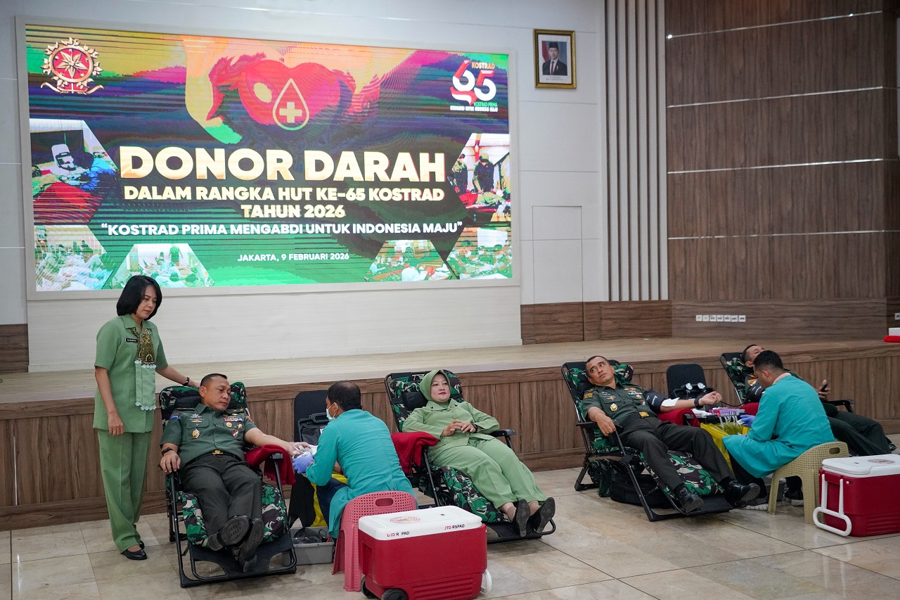 Jakarta – Dalam rangka menyambut Hari Ulang Tahun (HUT) ke-65 Kostrad, Panglima Kostrad (Pangkostrad) Letjen TNI Mohammad Fadjar, M.P.ICT didampingi Ketua Persit Kartika Chandra Kirana Gabungan Kostrad, Ibu Ira Fadjar, dan Pejabat Utama Kostrad mengikuti kegiatan donor darah di Ruang Mandala, Markas Kostrad, Gambir, Jakarta Pusat, Senin (9/02/2026).