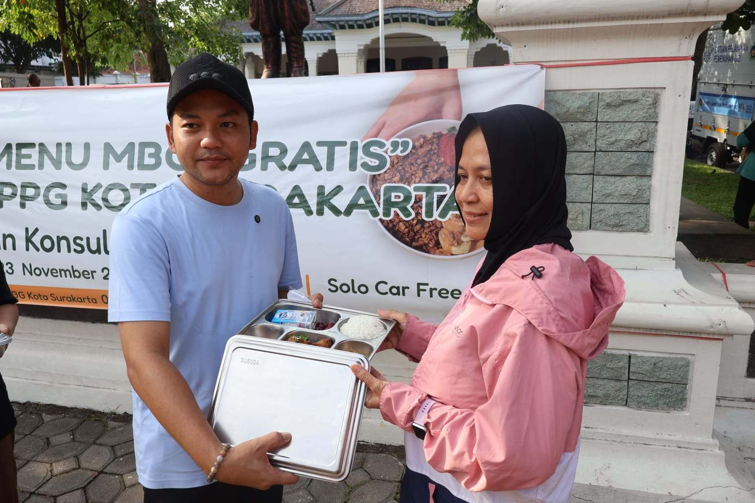 Surakarta – Satuan Pelayanan Pemenuhan Gizi (SPPG) Kota Solo bersama Pemerintah Kota Surakarta menggelar kegiatan Showcase dan Pembagian Program Makan Bergizi Gratis (MBG) pada gelaran Car Free Day (CFD) di halaman rumah dinas Wali Kota Solo, Loji Gandrung, Minggu (23/11).