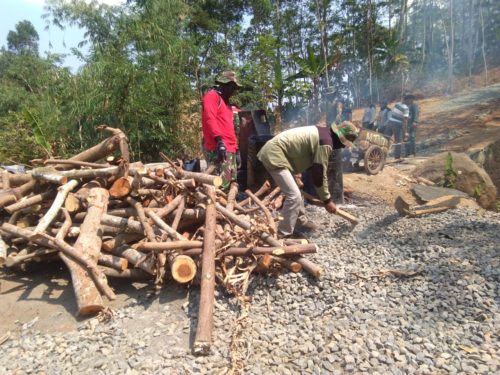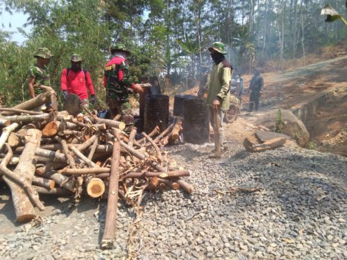 Batang – Tumpukan kayu yang terbakar dan kepulan asap dari panasnya aspal yang mendidih menjadi penanda hari ini pekerjaan mengaspal jalan dimulai. Warga dan Satgas TMMD reguler ke-103 Tahun 2018 sebagian mulai menyerok bubur aspal dan menyiramkanya ke panjang jalan yang telah diratakan. Sementara sebagian warga lainya menyerok sertu dan menaburkanya di atas jalan yang telah disiram aspal sebagai pelapis.