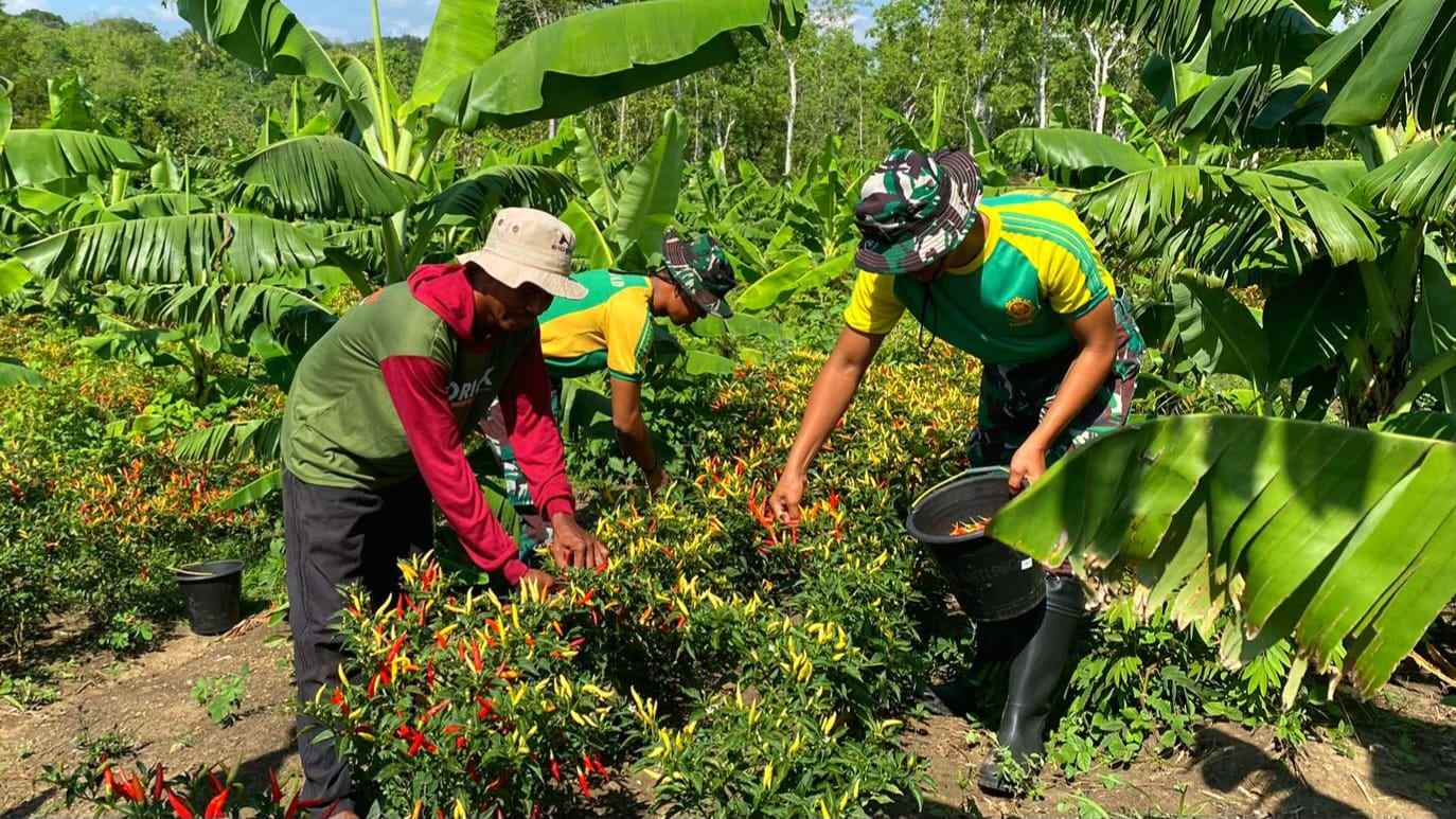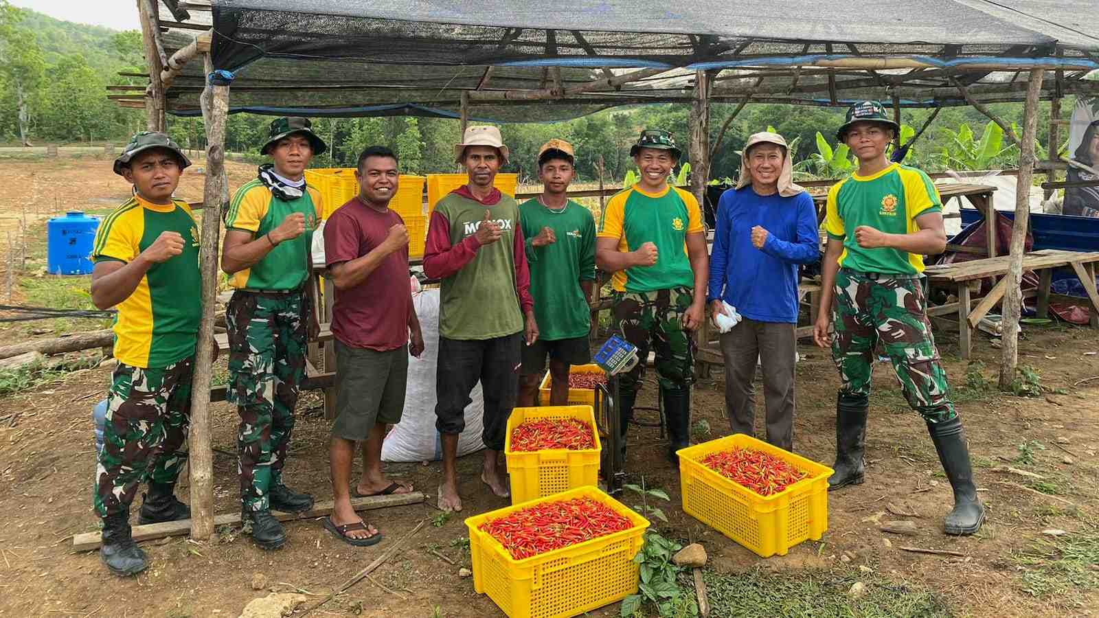 Dalam kegiatan tersebut, para prajurit bersama warga bergotong royong memanen cabai yang ditanam secara mandiri oleh kelompok tani setempat. Kehadiran Satgas tidak hanya membantu mempercepat proses panen, tetapi juga memberikan semangat kepada para petani agar terus produktif mengelola lahan pertanian mereka.