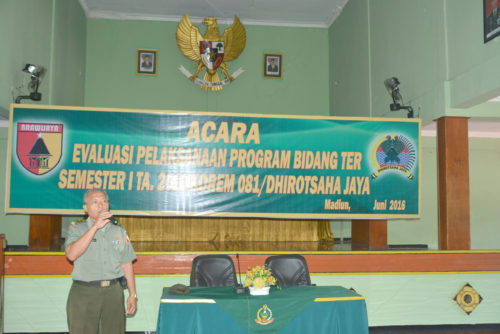 Dalam sambutannya Komandan Korem 081/DSJ yang di bacakan oleh Pasi Bin Komsos Korem 081/DSJ Mayor Inf Rudy Sujatmiko, SH menyampaikan Kegiatan Sisrendal Binter dan Evaluasi Pelaksanaan Program Bidang Teritorial Semester I Tahun 2016 ini, bertujuan untuk menyamakan persepsi tentang penyelenggaraan Pembinaan Teritorial di satuan bawah sebagai satuan pelaksana dan untuk mendapatkan segala masukan berupa pendapat maupun saran revisi tentang organisasi Satkowil serta Bujuk-bujuk sebagai referensi pelaksanaan kegiatan Binter di satuan pelaksana.