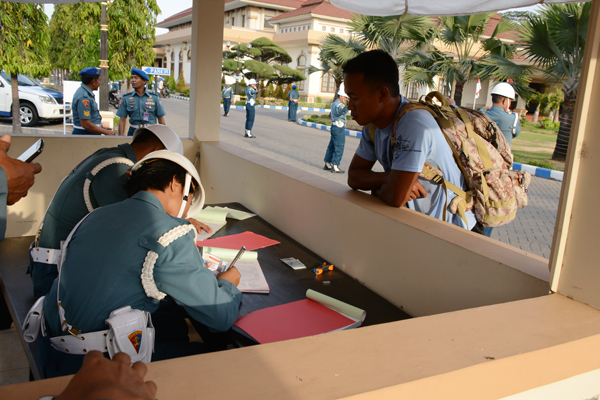 Surabaya – Guna mengaplikasikan ilmu dibidang Pemeliharan dan Ketertiban (hartib), Sebanyak 55 siswa Korps Polisi Militer (Pomal) yang sedang menempuh pendidikan di Pusat Pendidikan Polisi Militer (Pusdikpomal) Komando Pendidikan Dukungan Umum (Kodikdukum) Komando Pembinaan Doktrin Pendidikan dan Latihan Angkatan Laut (Kodiklatal) menggelar Latihan Praktek (Lattek) Aplikasi Pemeliharaan dan Ketertiban (Hartib) di Jl Utama masuk Kesatrian Bumimoro Kodiklatal.