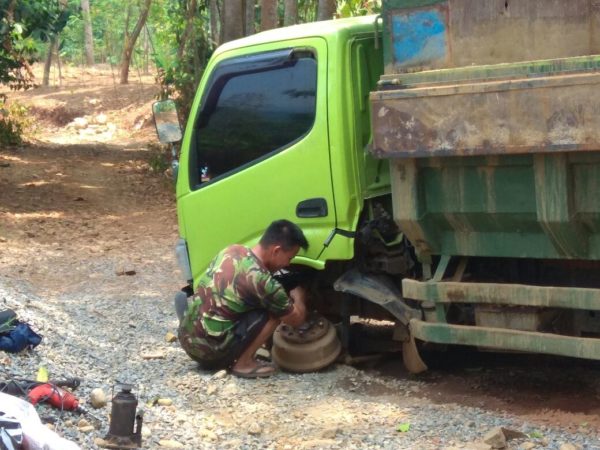 Seringkali terjadi kerusakan armada menuju lokasi TMMD di Desa Duren Ombo, kecamatan Subah, kabupaten Batang. Ini tidak menyurutkan semangat warga desa untuk membantu kelancaran kegiatan TMMD reguler. (Pen Ramil Limpung|Sudiyono|red)