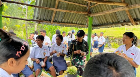 TTU – Satgas Pamtas RI–RDTL Sektor Barat Yonarhanud 2 Kostrad Pos Haumeniana melaksanakan kegiatan berbagi bubur kacang hijau di SMPN Satap Oetulu,