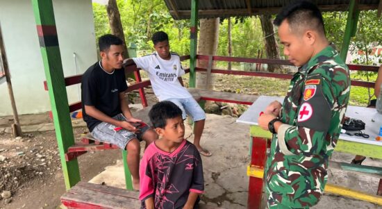Belu – Wujud kepedulian terhadap kesehatan masyarakat perbatasan, personel Pos Salore Satgas Pamtas RI–RDTL Sektor Timur Yonarmed 12 Kostrad melaksanakan pelayanan kesehatan