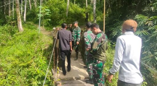 Pacitan, – Dandim 0801/Pacitan Letkol Arh Imam Musahirul, S.H., M.I.P bersama jajaran pemerintah Desa Gawang meninjau lokasi rencana pembangunan Jembatan Gantung yang