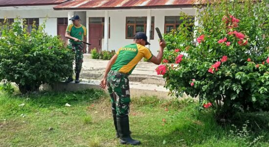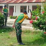 Malaka – Satgas Pamtas RI–RDTL Sektor Timur Yonarmed 12 Kostrad melalui Pos Motamasin melaksanakan kegiatan karya bakti di SD Metamauk, Kecamatan Kobalima