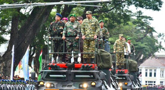 Medan – Lapangan Merdeka Medan berubah jadi lautan hijau loreng pada peringatan HUT ke-80 Tentara Nasional Indonesia (TNI), Minggu (5/10/2025). Upacara dipimpin