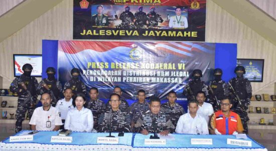 Makassar – Komando Daerah Angkatan Laut VI (Kodaeral VI) menggelar konferensi pers terkait Upaya Penggagalan Pendistribusian BBM Jenis Solar Ilegal Jaringan Sindikat