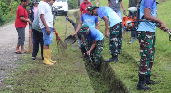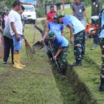 Kolaborasi di Perbatasan, Satgas Yonarhanud 2 Kostrad Bahu Membahu Bersihkan Jalan Desa Bersama Masyarakat