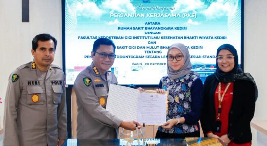 Kediri – Kepala RS Bhayangkara Kombespol drg. Agung Hadi Wijanarko Sp.BM, MARS, C.M.C, QHIA menunjukkan perjanjian kerja sama pengisian odontogram berstandar bersama