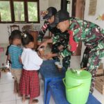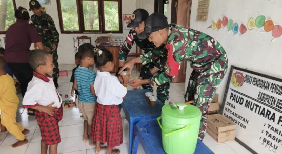 Belu – Satgas Pamtas RI–RDTL Sektor Timur Yonarmed 12 Kostrad melalui Pos Fatubesi Atas melaksanakan kegiatan pembagian bubur kacang hijau kepada anak-anak