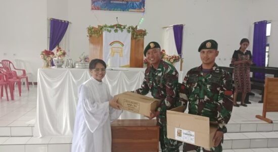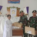 TTU – Satgas Pamtas RI-RDTL Sektor Barat Yonarhanud 2 Kostrad membagikan total 15000 buku bacaan rohani kepada Jemaat di seluruh Gereja sekitar