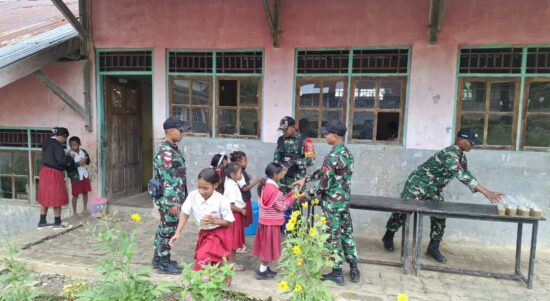 TTU — Satgas Pamtas RI–RDTL Sektor Barat Yonarhanud 2 Kostrad memberikan dukungan Tenaga Pendidik sekaligus bagikan bubur kacang hijau bergizi kepada siswa-siswi