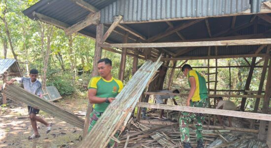 TTU – Satgas Pamtas RI–RDTL Sektor Barat Yonarhanud 2 Kostrad Pos Napan Bawah melaksanakan kegiatan karya bakti membantu pembangunan rumah salah satu