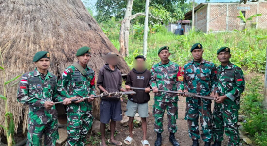 TTU – Satgas Pamtas RI–RDTL Sektor Barat Yonarhanud 2 Kostrad Pos Manusasi menerima penyerahan dua pucuk senjata api laras panjang jenis Springfield