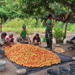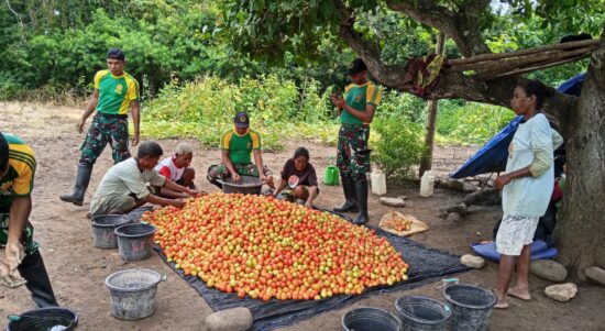 Belu – Satgas Pamtas RI–RDTL Sektor Timur Yonarmed 12 Kostrad melalui Pos Laktutus melaksanakan kegiatan panen tomat bersama masyarakat desa binaan di