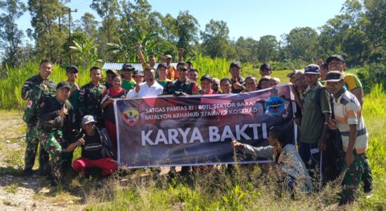 TTU – Personel Makosatgas Pamtas RI-RDTL Sektor Barat Yonarhanud 2 Kostrad tampak membaur bersama masyarakat dalam kegiatan Karya Bakti yang bertujuan untuk mengembalikan