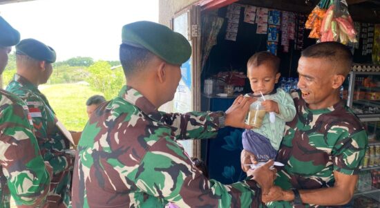 Belu – Personel Pos Laktutus Satgas Pamtas RI–RDTL Sektor Timur Yonarmed 12 Kostrad melaksanakan kegiatan berbagi bubur kepada warga di Desa Laktutus,
