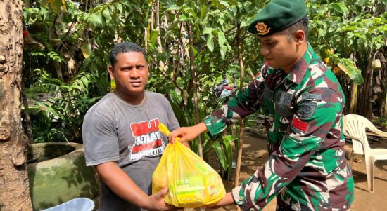 Belu – Satgas Pamtas RI–RDTL Sektor Timur Yonarmed 12 Kostrad melaksanakan kegiatan pembagian sembako kepada warga kurang mampu di Desa Dualaus, Kecamatan