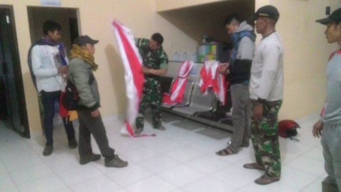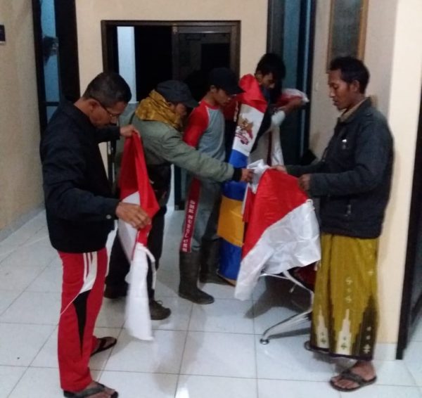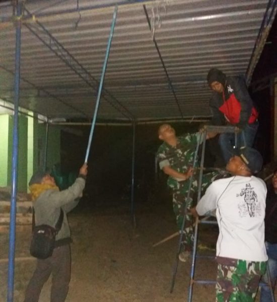 Aris Winarno bersama Babinsa memimpin warganya untuk mempersiapkan bendera dan umbul-umbul, selanjutnya memasangnya di lapangan desa. Kesibukan lainnya adalah pemasangan tratag juga dilembur malam hari, karena besok (10/7/18) TMMD resmi dibuka.