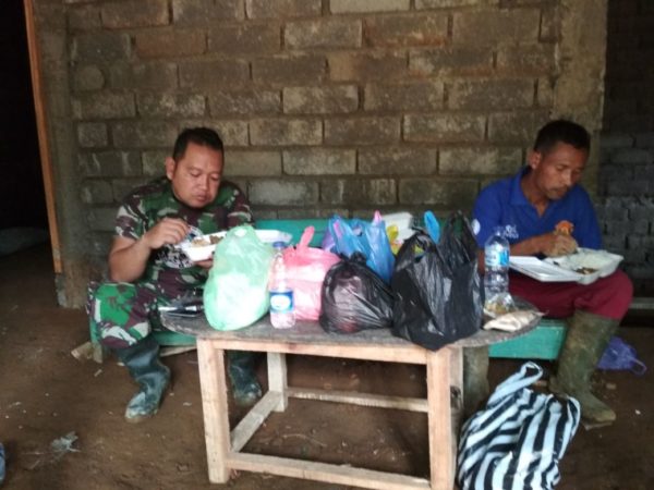 Hal ini seperti yang dilakukan oleh, Kopda Arif Satgas TMMD dari Yonif 405/Surya Kusuma yang menyantap hidangan siang berupa nasi bungkus atau nasi ponggol, bersama Romidi, Ketua Rt. 10 Rw. 04 Desa/Kecamatan Karangjambu, saat jeda siang sasaran rehab RTLH milik Muharso. Rabu (10/4/18).