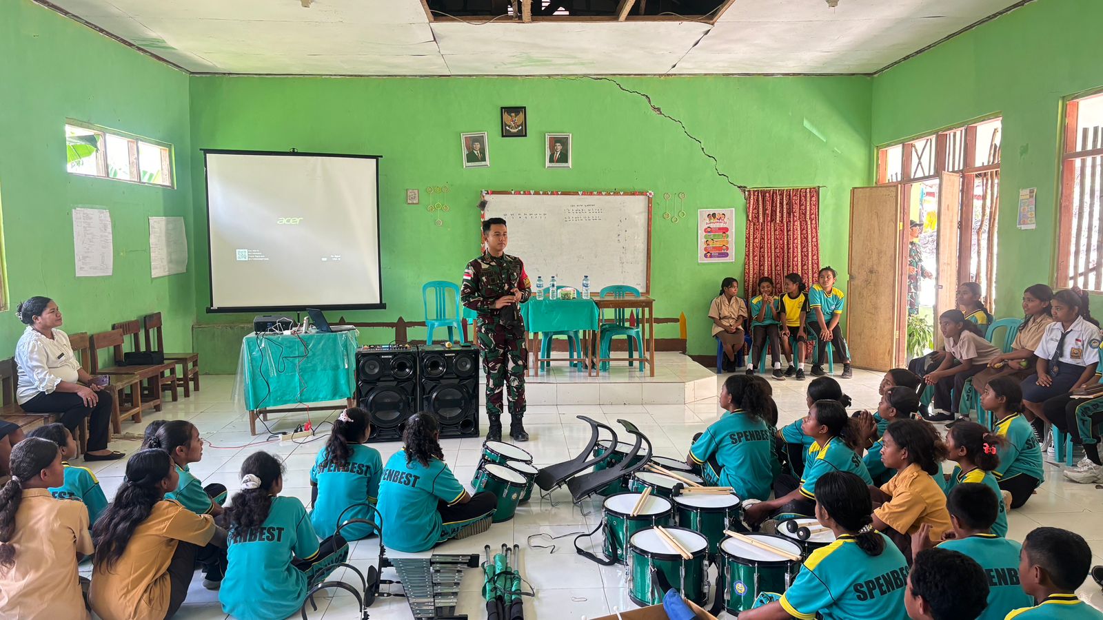 Tobu – Dalam rangka mendukung kemajuan pendidikan dan membina karakter generasi muda di wilayah perbatasan, personel Makosatgas Pamtas RI-RDTL Sektor Barat Yonarhanud 2 Kostrad memberikan pengajaran bermain Drumband kepada siswa-siswi SMPN Bestaumuti, Kecamatan Tobu, Kabupaten TTU, Rabu (29/10/2025).