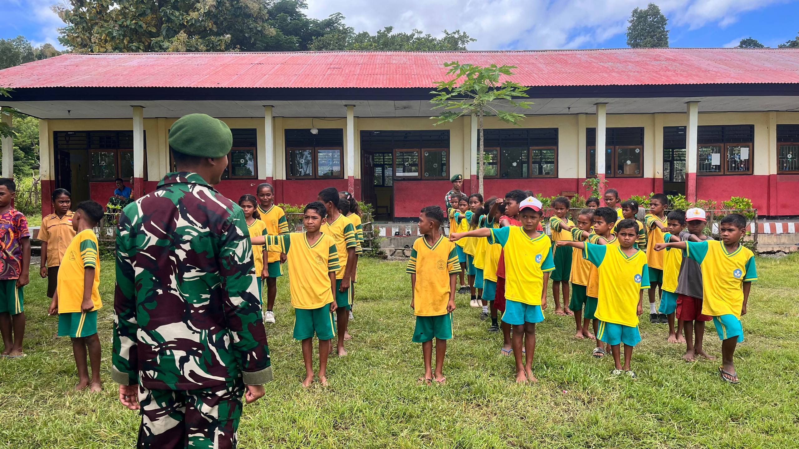TTU – Dalam rangka mempererat hubungan dengan anak-anak di daerah perbatasan, Satgas Pamtas RI–RDTL Sektor Barat Yonarhanud 2 Kostrad Pos Oepoli Sungai melaksanakan kegiatan berbagi ilmu kepemimpinan dengan materi PBB (Peraturan Baris Berbaris) kepada SDN Netemnanu, Kecamatan Amfoang Timur, Kabupaten Kupang, Senin (20/04/2026).