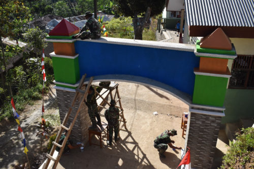 Terlihat Praka Sunari menikmati ketinggian melanjutkan pengecatan gapura pada bagian mahkota dengan warna merah hati. Selain warna tersebut, hijau daun, biru laut, orange dan putih kini mendandani gerbang tersebut.