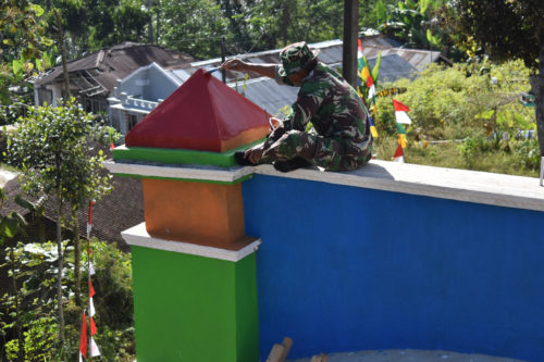 Banjarnegara – Menstimulasi gairah belajar murid SDN 1 Pasegeran Kecamatan Pandanarum, anggota Satgas TMMD Reguler 102 Banjarnegara memulas pintu gerbang sekolah tersebut dengan warna-warni kesukaan anak-anak. Kamis (2/8/18).