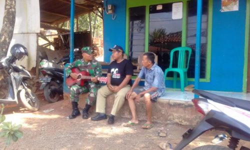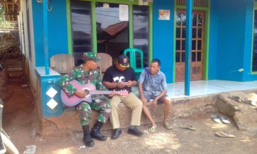 Adalah Sertu Hartono, Satgas TMMD bersama warga Durenombo yang sedang bercengkrama sambil memainkan gitarnya dengan lagu-lagu pop terkini di sebuah teras rumah pak Yanto(45) RT 03/RW 02 depan Pos Kotis TMMD,mereka terlihat gembira sambil menikmati semilirnya angin sore dan di temani teh hangat.Rabu (24/10/2018).