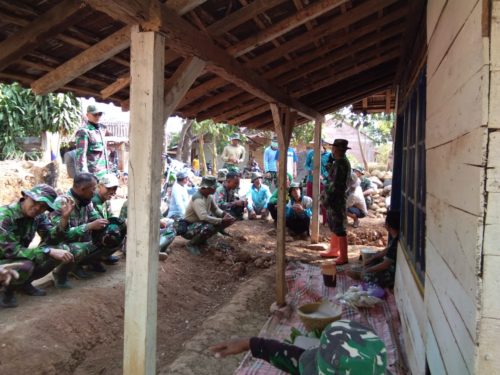 Dari pantauan di lokasi, warga bersama Satgas TMMD mulai membongkar bangunan rumah milik Surip. Sebagian lagi sibuk menyiapkan material seperti batu kali, pasir dan semen untuk pembuatan pondasi.