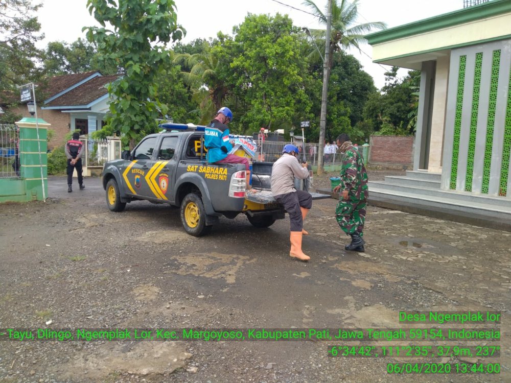 Pati – Team gabungan dari TNI-Polri dan Relawan Kabupaten Pati Dalam aksi penanggulangan virus Covid-19 terus bergerak dari Desa Satu ke Desa yang lain,Kali ini giliran Desa Di utara kota Pati tepatnya di desa Ngemplak lor Kecamatan Margoyoso di adakan penyemprotan dan pembagian sembako kepada warga Desa Ngemplak lor (05/04/2020)