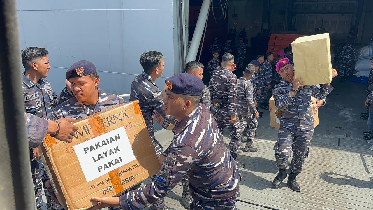 KRI Semarang-594 ini membawa bermacam-macam bahan yang terdiri dari sembako, minuman, matras, pakaian, selimut, perlengkapan mandi, toren, dan lain-lain untuk korban terdampak bencana.