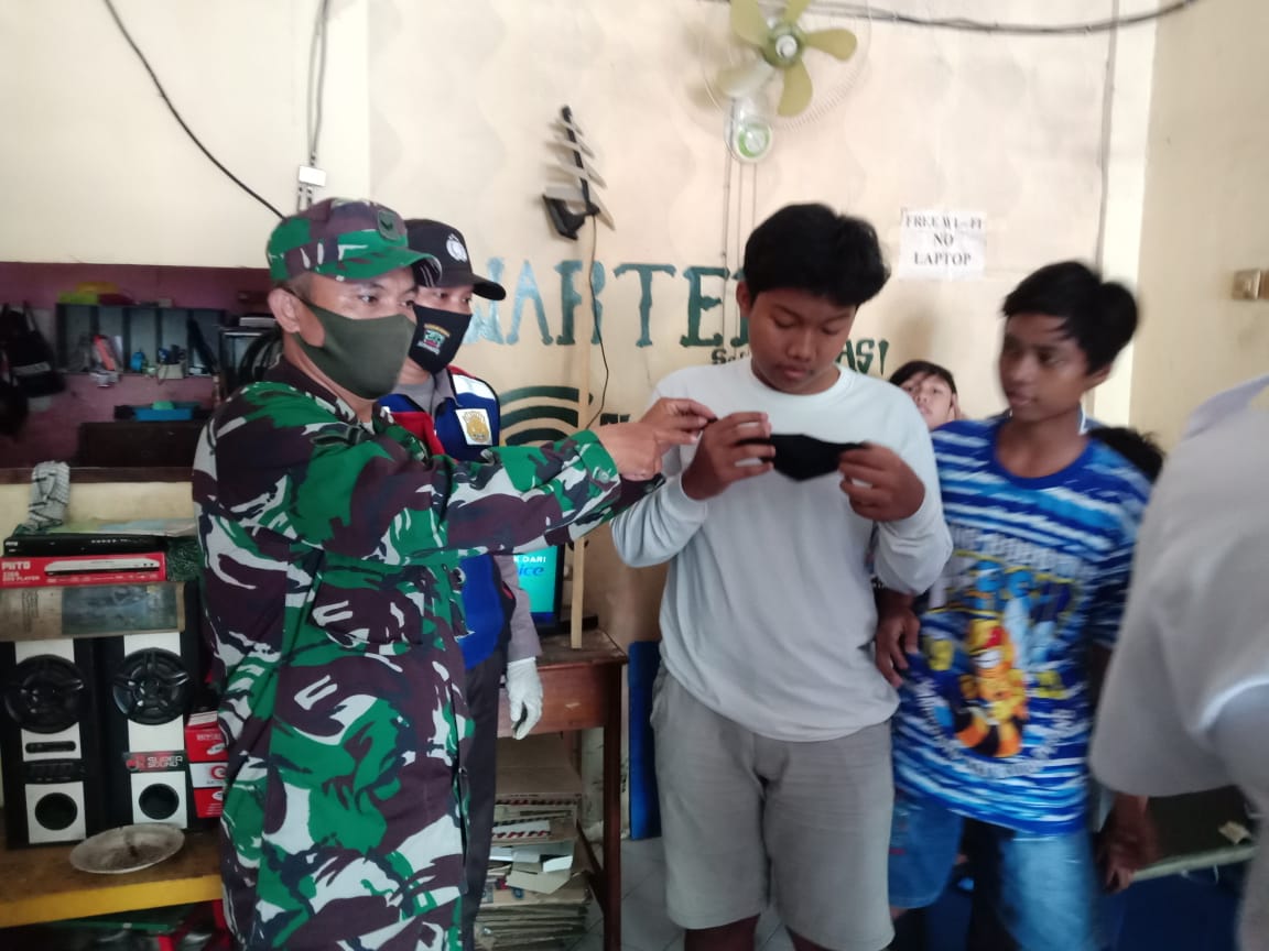 Surabaya – Babinsa Koramil Tipe A 0831/02 Tambaksari Serda Komarudin bersama Bhabinkamtibmas, Lurah Gading, Ketua LPMK serta staf kelurahan Gading memberikan himbauan kepada pengunjung di warkop tentang tatanan normal baru saat pandemi covid 19.