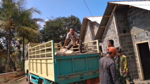 Nampak warga yang sedang menurunkan semen yang akan dipakai untuk memplester lantai,dinding dan teras rumah bapak Carip,hal tersebut dilakukan pasalnya selain rehab rumah sudah memasuki tahap juga agar tidak terhambat dalam pengerjaannya. “Tinggal plesteran dinding,lantai dan teras rumah pak yang belum,jadi material semen sangat dibutuhkan guna mempercepat pekerjaan biar cepat selesai,”jelasnya Carip.