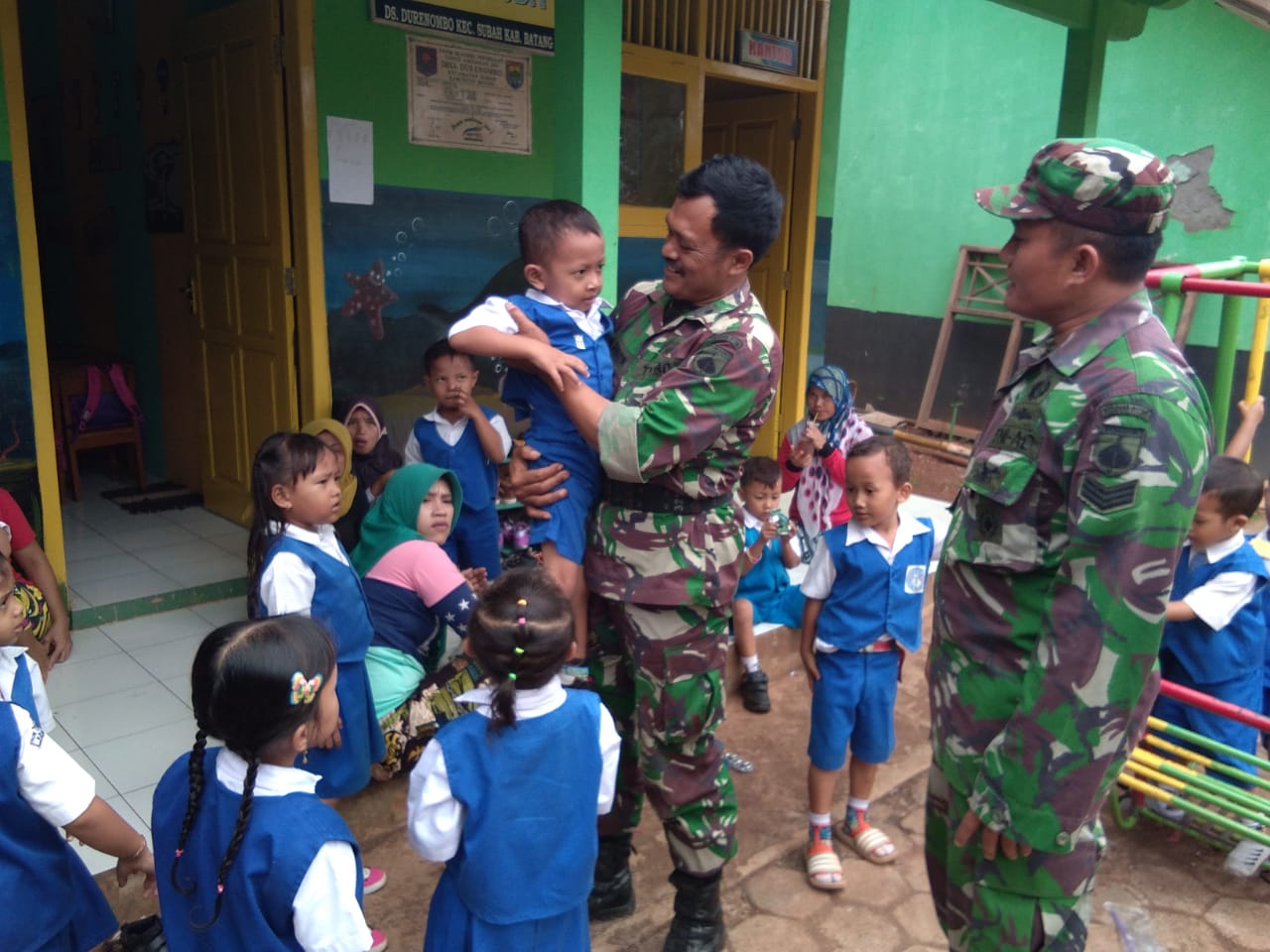 Kegiatan dilaksanakan di TK Tunas Muda desa Durenombo kecamatan subah,selain untuk memperkenalkan anggota TNI juga memberi motivasi pada anak-anak TK tersebut,”Kegiatan dilaksanakan sebagai sarana memperkenalkan diri tentang aparat negara yang menjaga kedaulatan NKRI,”ujar Ruayah (45)Guru pembimbing TK Tunas Muda.
