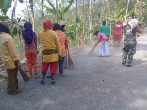 Slogan tersebut dibuktikan setiap harinya dengan bersama masyarakat baik laki-laki, perempuan, tua maupun muda bahkan anak-anak, ikut terjun membantu Satgas TMMD bergotong royong secara estafet menyalurkan batu gunung maupun material lainnya, sebagai upaya hemat tenaga serta mempercepat pekerjaan pengerasan jalan yang pada hari ini memasuki hari ke-2. selasa (16/10/18).