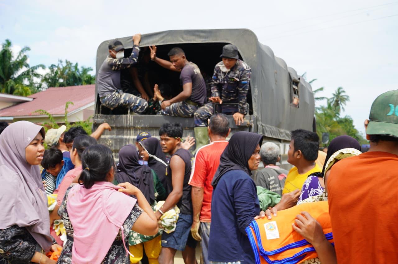 Prajurit TNI AL turut terjun langsung ke lokasi-lokasi terdampak dengan menyusuri desa-desa yang terendam banjir, memastikan bantuan diterima secara tepat sasaran. Selain menyalurkan bantuan logistik, prajurit juga membantu masyarakat dalam proses distribusi serta memberikan dukungan moril kepada warga yang terdampak bencana.