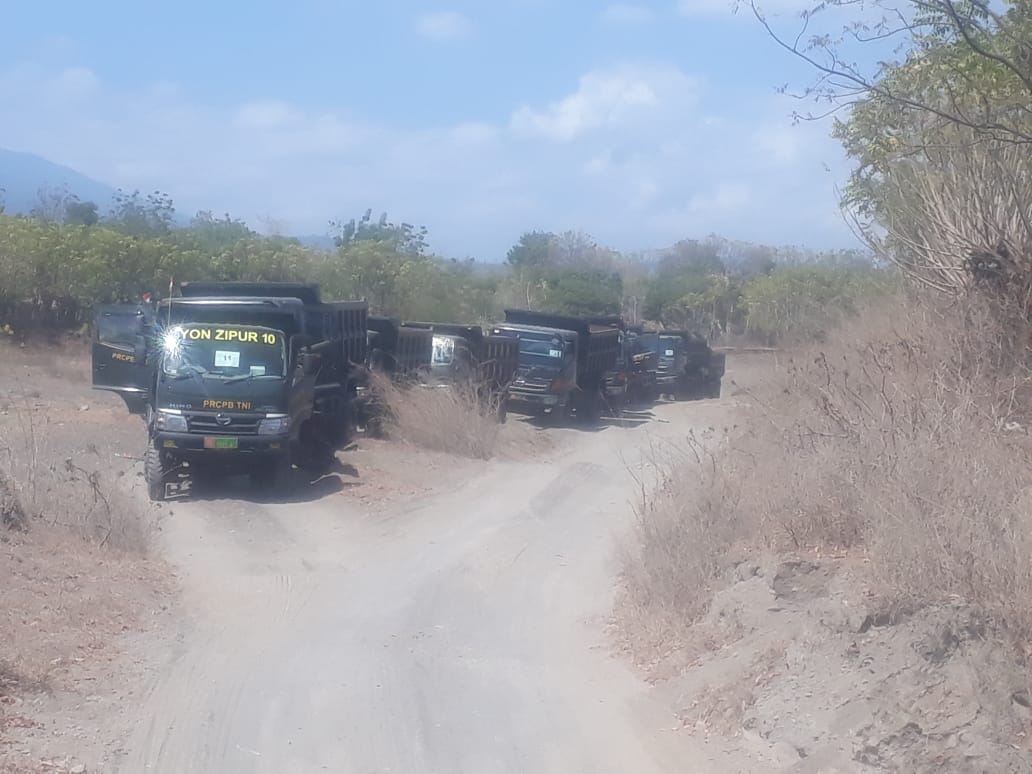 Dengan mengerahkan beberapa alat berat dan truk milik TNI, pasir diangkut dari sungai terdekat yang sudah mengering, selanjutnya ditempatkan di lapangan sebagai depo dan dapat digunakan oleh warga secara cuma-cuma untuk membangun rumahnya yang rusak terkena dampak gempa. (Puspen TNI|red)