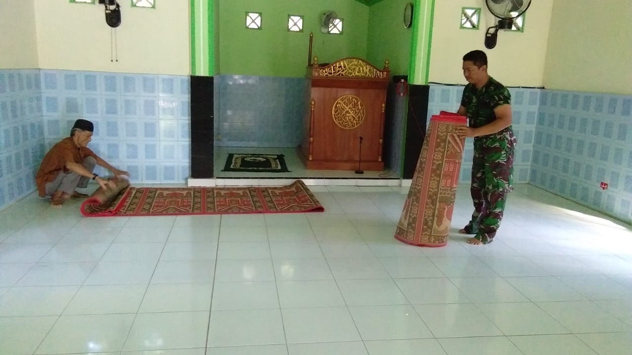 Nganjuk – Bintara Pembina Desa (Babinsa) Serda A. Roga Anggota Koramil 0810/01 melaksanakan gotong- royong bersama pengurus Masjid Baiturrahman melakukan bersih-bersih Masjid di Kel Kartoharjo Kec/Kab. Nganjuk. Kamis (07/02)