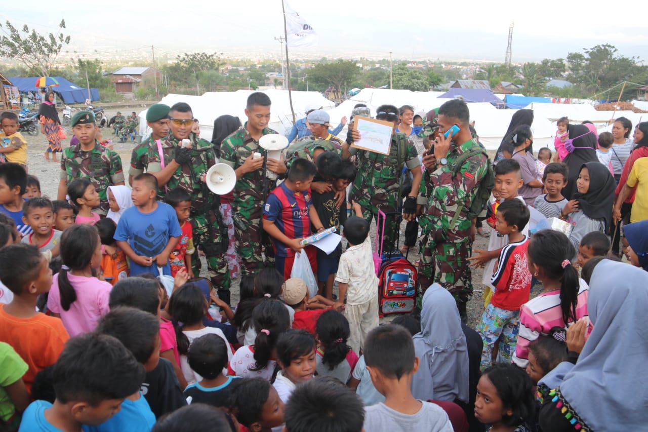 Palu – Prajurit TNI dari Batalyon Infanteri Raider 700/Wira Yudha Cakti (WYC) Kodam XIV/Hasanuddin dipimpin Lettu Inf Sahang dan Batalyon Infanteri Para Raider 432/Waspada Setia Jaya (Yonif Para Raider 432/WSJ) Divisi 3/Kostrad dipimpin Kapten Inf Nur Cahyo,menggelar lomba menggambar bagi anak-anak pengungsi di Sulawesi Tengah (Sulteng).