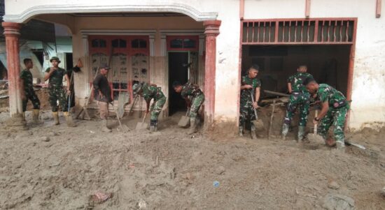 Tapanuli Selatan – Satgas Penanggulangan Bencana Alam (Gulbencal) Kodim 0212/Tapanuli Selatan bersama Polri melaksanakan kegiatan pembersihan dampak banjir bandang di Desa Huta