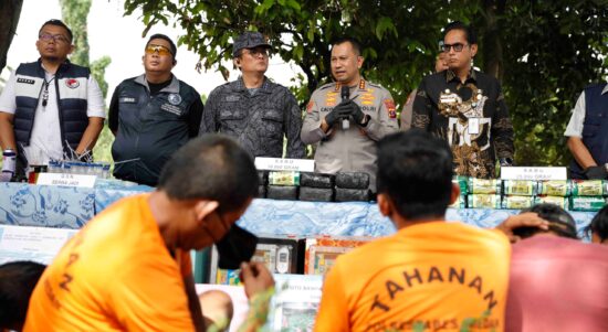 Medan – Kapolrestabes Medan Kombes Pol Dr Jean Calvijn Simanjuntak memimpin konferensi pers pengungkapan besar kasus narkoba di pinggiran Sungai Lingkungan Pria