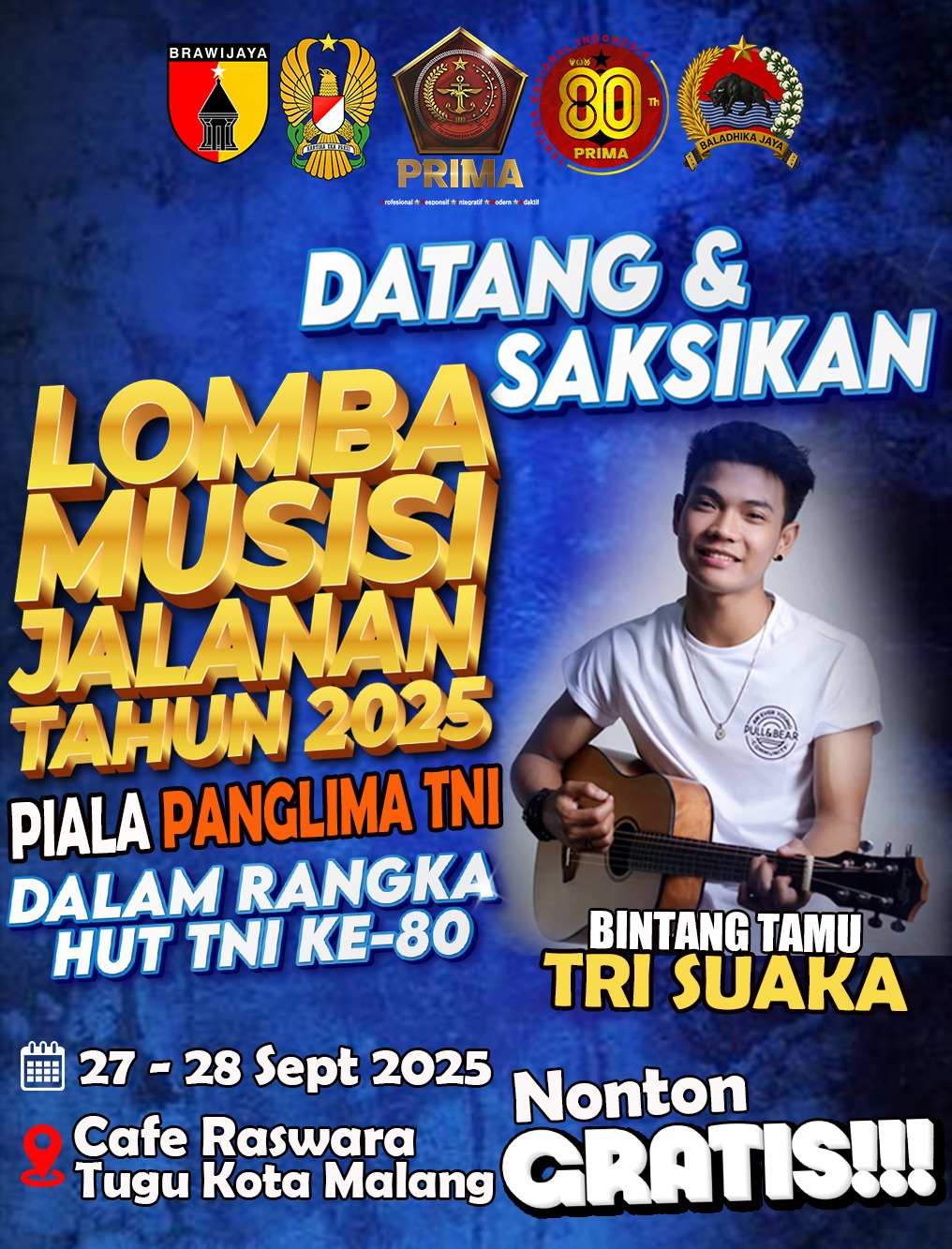 Malang – Perayaan HUT TNI ke-80 kali ini terasa berbeda dan penuh warna. Korem 083/Baladhika Jaya menghadirkan Lomba Musisi Jalanan Tahun 2025 yang diikuti musisi jalanan dari berbagai kota/kabupaten di Jawa Timur.