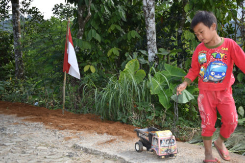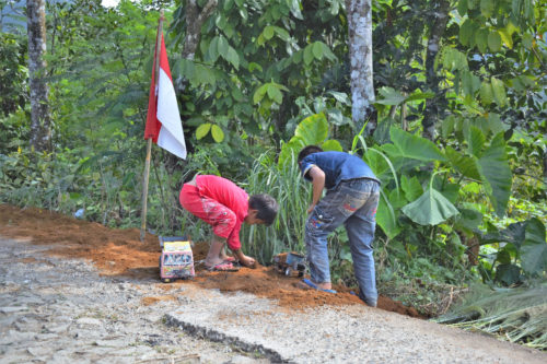 Banjarnegara – Tak mau kalah dengan para orang tua dan tentara dalam merampungkan pekerjaan pembereman jalan. Jesen (8) kaos merah dan Hamdan (12), juga ikut memastikan ketersediaan material TMMD dengan caranya sendiri.