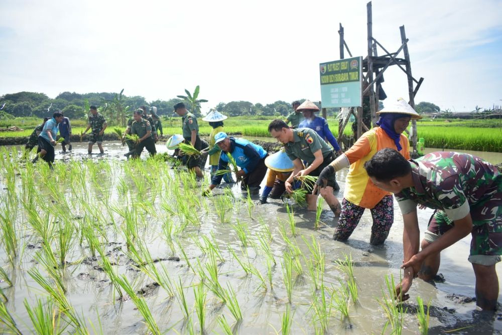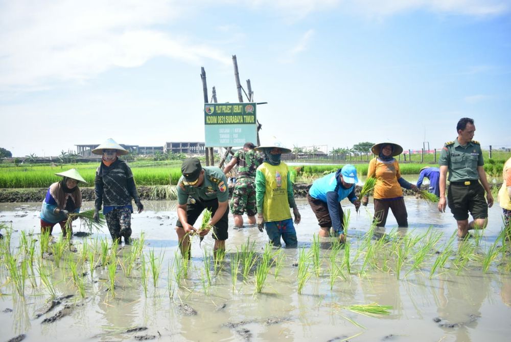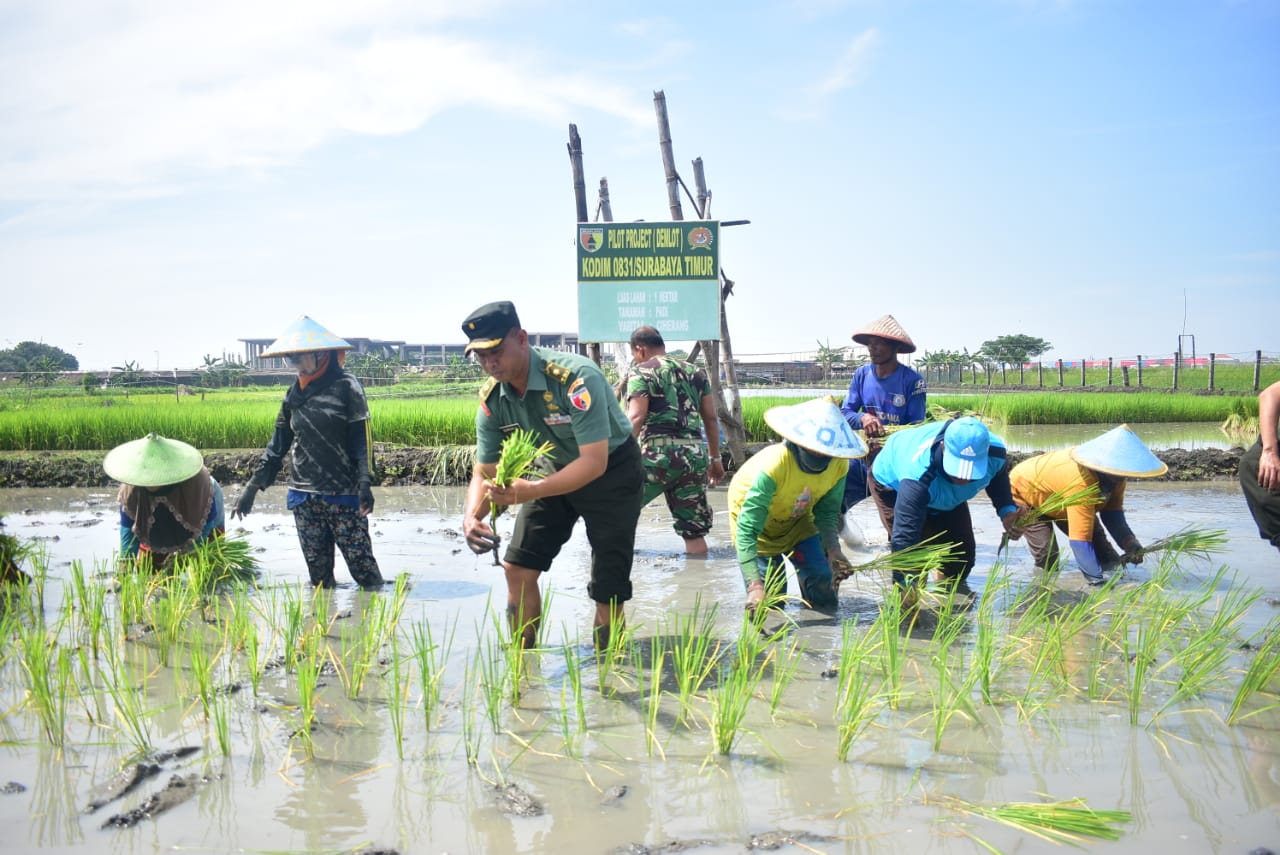 Surabaya – Kodim menggelar tanam padi bersama masyarakat petani poktan Benteng samudra bertempat dilahan persawahan kelurahan kedung cowek,kamis (02/04/19).